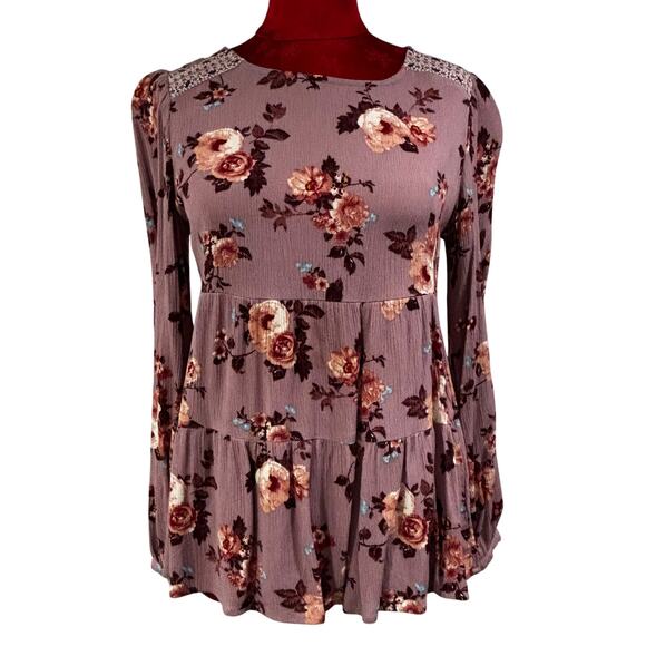 Knox Rose size XS pink floral blouse - a long sleeve peasant prairie style top with casual Boho vibes. 100% rayon has a crinkle cotton feel - keyhole button at the neck back - lacy details at the shoulders. Gently worn - no flaws - so cute!
