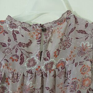 Knox Rose sleeveless blouse - size small. Has keyhole loop button at back of neck. Pretty purple, mauve, white and gold floral print sheer fabric, 100% polyester. Smoke-free home.