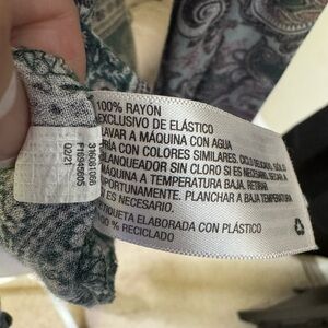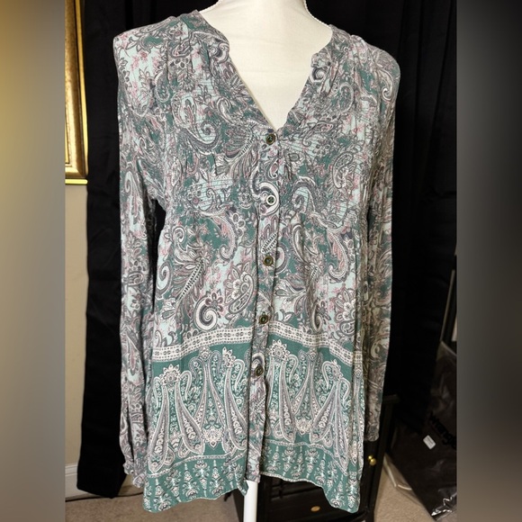 Very pretty colors and print. Button front, smocked and pleated detail, long sleeve, elastic gathering at wrist blouse, slightly longer in back. Size Small. Good pre owned condition.