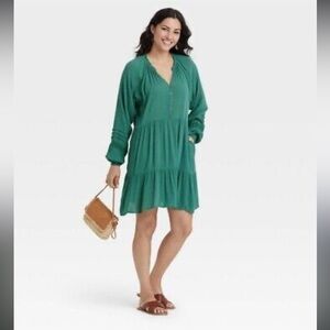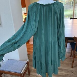 This gauzy flowy tunic top or dress features a V-neckline and long sleeves with decorative pintucks near the cuffs. The soft, muted dark green color adds a touch of elegance to the relaxed fit. Goes great into fall with boots and a sweater. SZ XXL. Please confirm measurements approximate laying flat in pictures as Poshmark does not accept returns for fit issues. Please see all eight pictures and one video for visual description.
