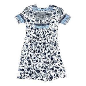 Knox Rose XS Floral Boho Short Sleeve Dress Blue White Soft Knit Summer Casual