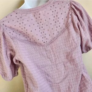 This blouse is a pretty dusty lilac color. Feature puffy shoulder sleeves, eyelets, lace around the neckline and a waffle type pattern through the rest of the blouse. Pit to pit measurement is 18 inches across and length is 22 inches