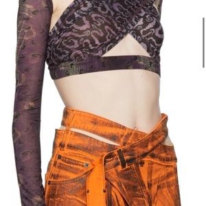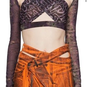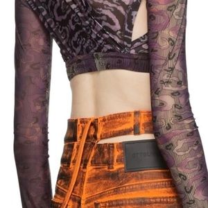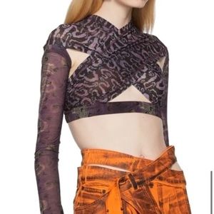 Long sleeve semi sheer stretch jersey blouse featuring multicolor graphic pattern throughout cut outs at the chest and armscyes elasticized hem