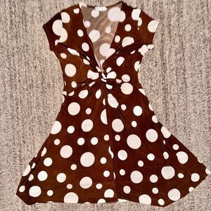 Color is brown with white cream polka dots, made of a light poly blend super cool for summer, v neck cut