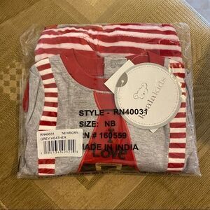 A Santa face and red and white stripes make this two-piece set perfect for the Christmas season. This Koala Baby set features a long sleeve bodysuit with a tie print and Santa graphics. The coordinating pants feature festive horizontal stripes with an elastic waist and attached feet