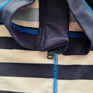 Soft and smooth material in white and navy blue horizontal stripes accented with royal blue stitching on seams, matching royal blue whale on front, solid navy blue sleeves, and eight inch zip-up on the back (material covers zipper against baby's skin). UV sun protection in the material is rated UPF 50. According to tag 6 months will accommodate 17-21 pounds and 24-27" height. Pet friendly home but kept in spare room in tub. Wood background is dining table, not the floor.