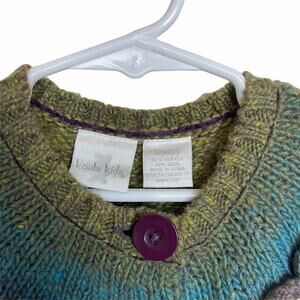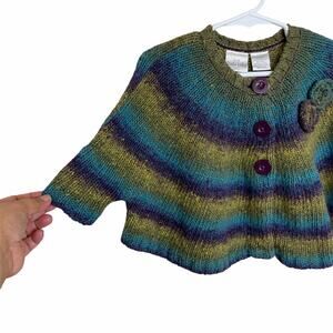 Features- front button, sweater knit, knit rosettes, sleeves w/i poncho, acrylic/wool blend