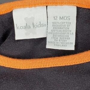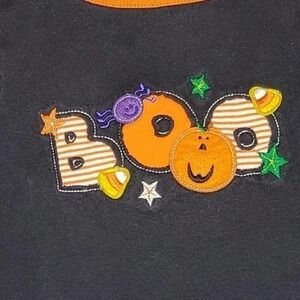 Features : Halloween, orange scallop trim, long sleeves, “boo”, pumpkin, candy corn