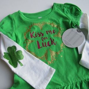 This adorable toddler girls Kiss Me for Luck shamrock tee-shirt is sure to be a favorite! Koala Kids Baby Girl Shamrock Green St Patrick's Day Kiss Me for luck Long Sleeve Shirt. Glitter shamrock on each elbow part of the shirt.