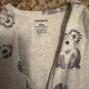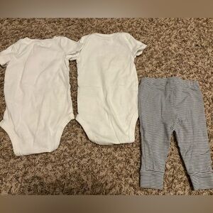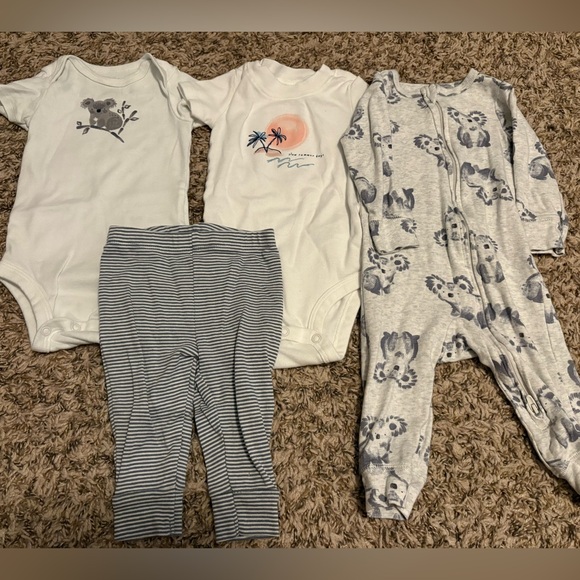 Cute neutral set from Carters, includes two bodysuits, one pair of pants, and a footless sleeper. Perfectly light and cool for summer weather, in great condition with no rips or stains. Size 6months.