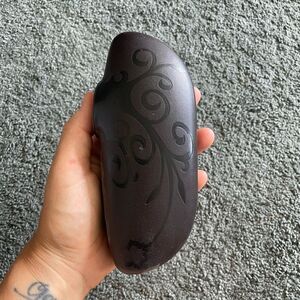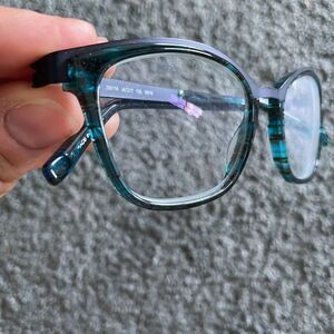 Includes case. The glasses are a mix of acetate and metal. Really pretty blue design. I tried to get close up of it, but super hard to get.