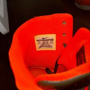 Dynamic Nike high-tops with striking orange and black colorway. Ideal for active and casual wear.