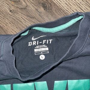 Nike short sleeve tee with 'Never Fold' teal graphic. Dri-FIT fabric for comfort.