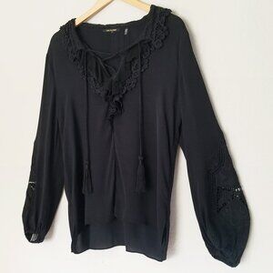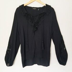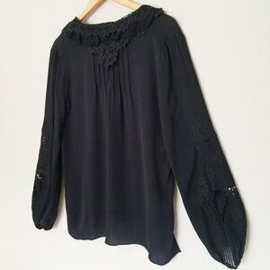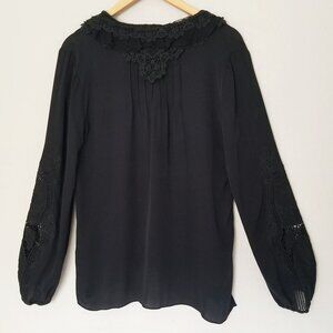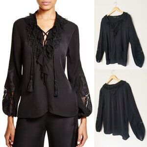 Kobi Halperin 100% Silk Laced Up Ruffle Trim Crochet Sleeve Blouse Top Black M