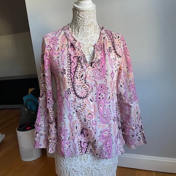 Kobi Halperin 100% Silk Pink Paisley Boho Long Sleeve Blouse sz XS