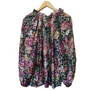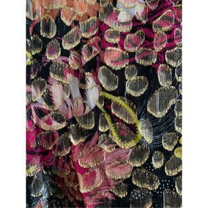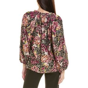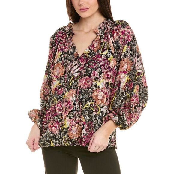A jacquard of metallic petals brings shimmery depth to an in-bloom blouse punctuated with bright paisley elements.