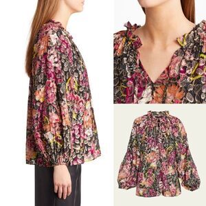 Kobi Halperin's August metallic jacquard blouse is complete with a ruffled V-neck and balloon sleeves. Elasticized cuffs, Relaxed fit, Pullover style.