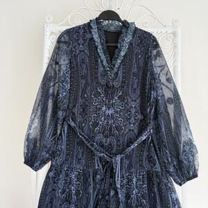 Elegant and Romantic Kobi Halperin dress in size XS. Features an Ornate Blue Paisley pattern and a Boho Chic Fit & Flare silhouette with sheer Long Sleeves. Perfect for a Date Night, Cocktail Party, or Fall Wedding Guest.