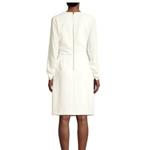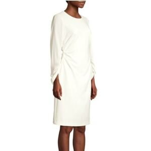 imeless and tailored, the Kobi Halperin Drew Sheath Dress in ivory is a refined wardrobe staple. Designed with a flattering silhouette, this dress features a round neckline, gathered three-quarter sleeves, and a hidden back zip closure for a clean, elegant finish. The soft ivory hue adds a touch of sophistication, making it ideal for work, special occasions, or elevated everyday wear.