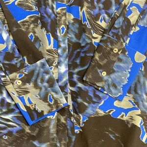 Stunning 100% silk royal blue, black and grey floral relaxed fit long sleeve tunic top by Kobi Halperin. Natural Mother of pearl buttons trim the cuffs and mandarin collar and are hidden down the covered button down front. A chic and modern tunic that’s easy to dress up or down and flows seamlessly from day to night. Tall side slit shirt hem is perfect to pair with leggings and skinny jeans. Box pleated back for comfortable movement. In Flawless like new condition, size Small S
