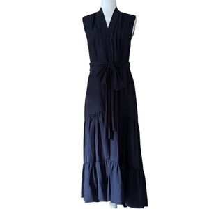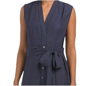 Chic navy dress with a high-low hem. Features a sleeveless design and button details. Perfect for stylish outings.