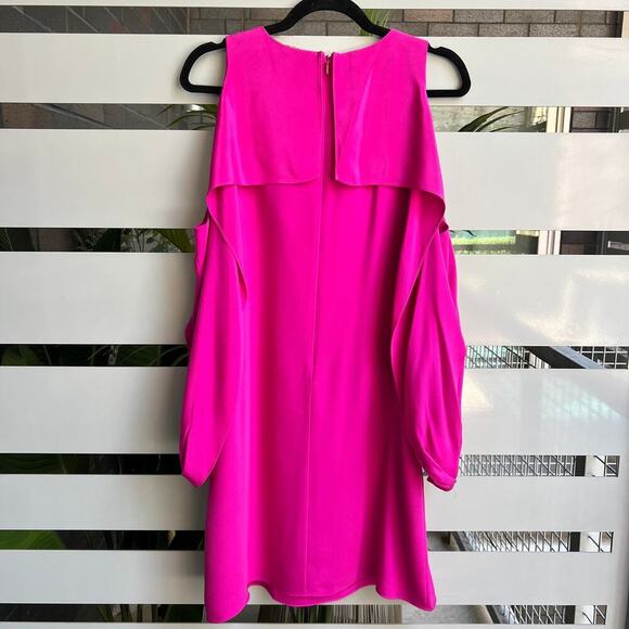 Kobi Halperin "Raina" dragonfruit (magenta) cold shoulder silk sun dress. Ruffle flounce bodice with sheath silhouette. Long sleeves. Hidden back zip. Size small - 18" pit to pit; 26" length from pit.