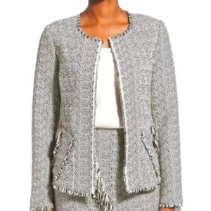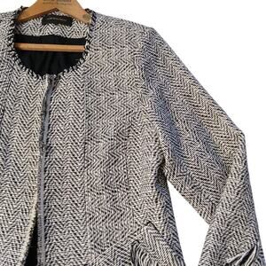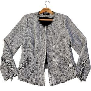 Kobi Halperin Sydney Deconstructed Herringbone Jacket in black and white with fringe details, size large.