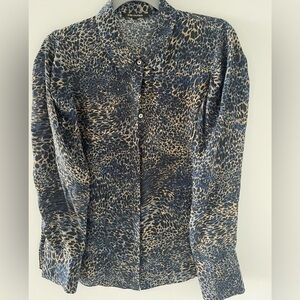 Kobi Halperin Women’s Blouse Size Medium Blue Brown Tan Silk Long Sleeve Silk