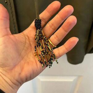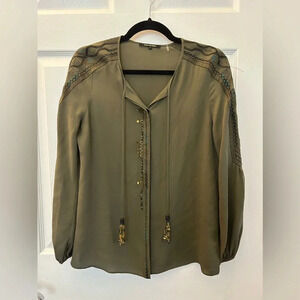 Beaded tassels compliments the intricate embroidery on this silk blouse, flaunting long puff sleeves.