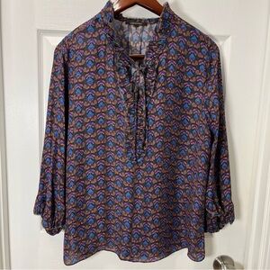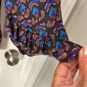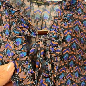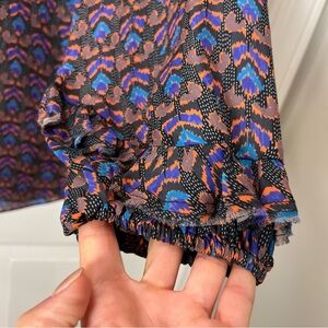 Kobi Halperin Robyn Blouse, size Large, Silk blend, all over Ikat print with brown, copper, blue and purple, v-neck, front keyhole with ties, long sleeves, ruffle trim, elasticized cuffs, side slits/ vents, back box pleat detail.excellent condition