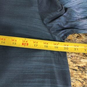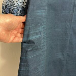 This dress is a knee-length, straight-cut shirt dress in a deep navy blue fabric. It features a collared neckline with a concealed button placket on the upper front. The standout detail is the sleeves, which has 3/4 length and feature a gradient tie-dye pattern transitioning from the dress (which also has a gradient pattern) into shades of white and blue, with intricate geometric patterns near the cuffs. The cuffs are buttoned, adding a tailored touch. The overall look is modern suitable for both casual and semi-formal settings