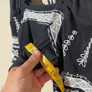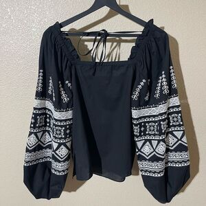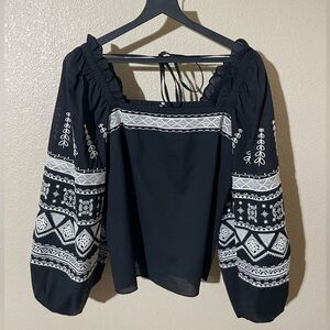 Chic black blouse featuring detailed white embroidery. Stylish and versatile design.