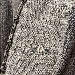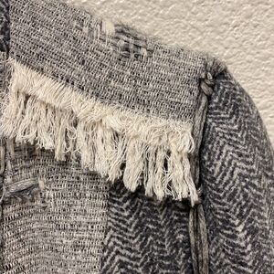 Gray and cream textured open front blazer from Kobi Halperin. Fringe detail at shoulders and hem. Size small.