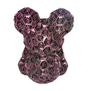 This geometric bear sculpture features an intricate rose-like surface pattern with an iridescent color-shift finish, freestanding and sculptural in form. Pre-owned and in excellent condition