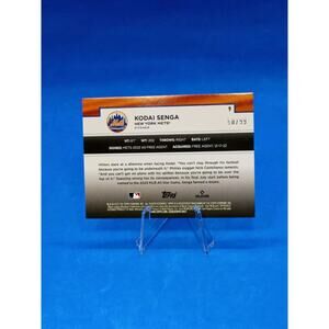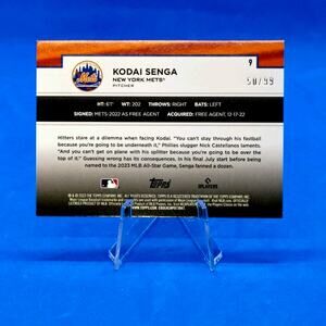 The product is a rare and highly sought-after sports trading card featuring Kodai Senga of the New York Mets, a promising athlete in the world of sports. Manufactured by Topps for the 2023 SP set, this short print card is numbered #9 out of a limited edition of 50/99. This unique and limited card is a valuable collectible for fans and collectors alike, showcasing the talent and potential of the player it represents.