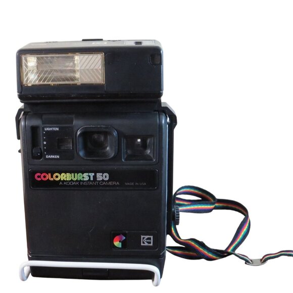 A vintage piece of photographic history, this Kodak Colorburst 50 offers instant prints with classic charm. Equipped with a rainbow strap and flash.