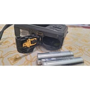 Excellent condition. The only thing of note is the lens cover doesn't close 100%- see pics. Uses 2 AA batteries. Includes a 2gb card, and can be used without a card.