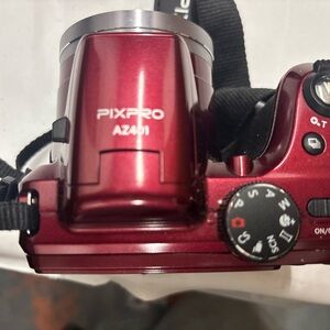Compact Kodak camera in vibrant red. Perfect for stunning photos. Easy to use.