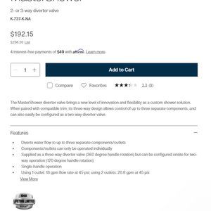 Kohler MasterShower 2 or 3 way diverter valve. BRAND NEW!