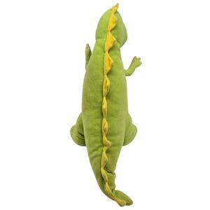 This adorable dinosaur is green with gold accents and yellow spines down his back.