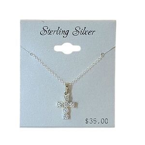 Elegant sterling silver cross necklace with a sparkling design. Perfect for any occasion. The pendant is a soft gold color, and the chain is Stirling Silver