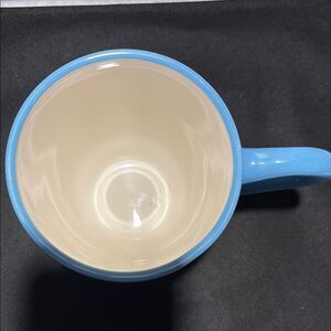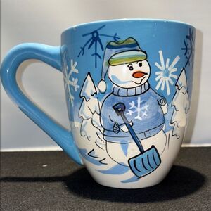 Charming snowman design. Blue handle and accents. Perfect for winter beverages.