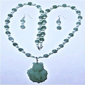 Green – Made with 6/0 white pearled seed beads, 4mm light green crystal bicones, silver filigree bead caps, 8mm green Jade beads and a 53 X 33 carved green Jade koi fish focal. The necklace is strung with green Soft Flex with and has a lobster clasp closer. It measures 27”long. The earring are hung on Sterling wires and measure 2”.