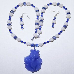 Blue – Made with 4mm blue crystal bicones, silver filigree bead caps, 8mm white Jade beads, 3mm silver spacers,8mm blue Czech glass crystal rondelles, and a 53X 33 carved blue Jade koi fish focal. The necklace was strung with blue lapis Soft Flex wire and has a lobster clasp closer. It measures 20”. The earrings are hung on Sterling wires and measure 2”.