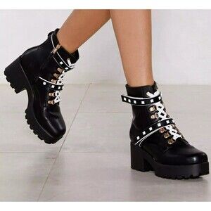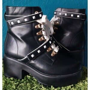 Features: White laces up the front, side zip closure, Straps with white studs, block platform heel
