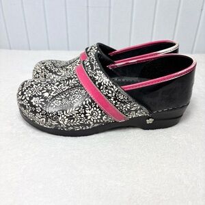 Koi Sanita Black and White floral Patterned Clogs with Pink Accent Size 40