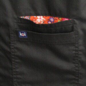 Koi Stretch women's black scrub top with 1 red floral pocket for nurse doctor veterinarian CNA vet tech.