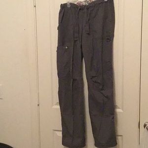 Olive grey Koi by Kathy Peterson scrubs. Top has short sleeves, v neck, 2 pockets and a tie at the waist. Pants have elasticize drawstring waist, 3 front pockets and 2 back pockets. 55% cotton, 45% polyester. Size Medium