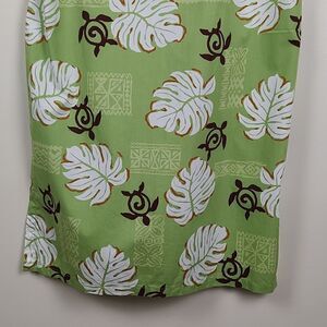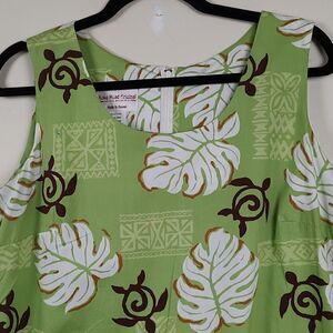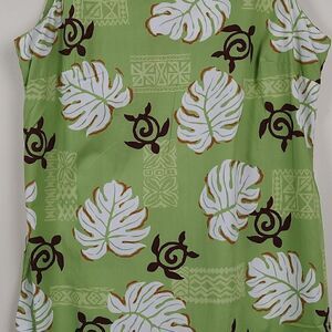 Koko Head Original Tropical Print Shift Midi Dress in green, brown and white. This dress features a round neckline, sleeveless, hidden zipper in back, and 2 side vents. 100% cotton. Size Large.