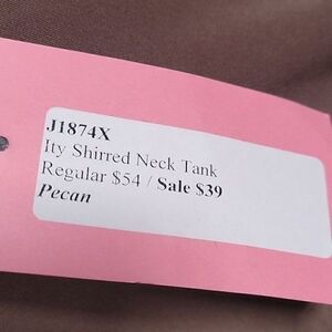 This brown tank top from Kokoon has a shirred scoop neck. Content: 90% polyester, 10% spandex. Care: hand wash, line dry.